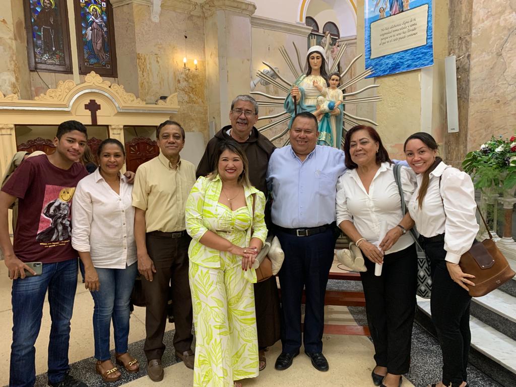 | Luis Eduardo Acosta Medina (Vestido de azul), con su familia, al frente de la imagen de 'La Vieja Mello', en la Catedral 'Nuestra Señora De Los Remedios', de Riohacha |